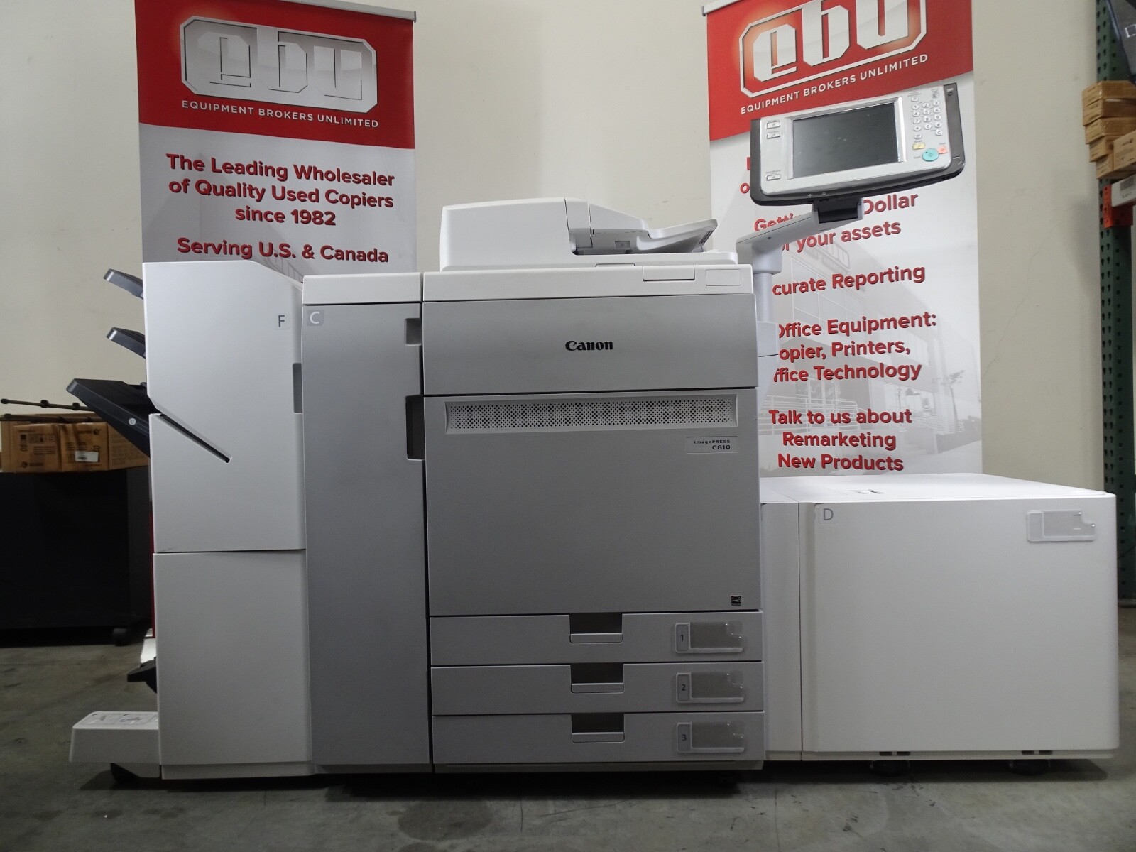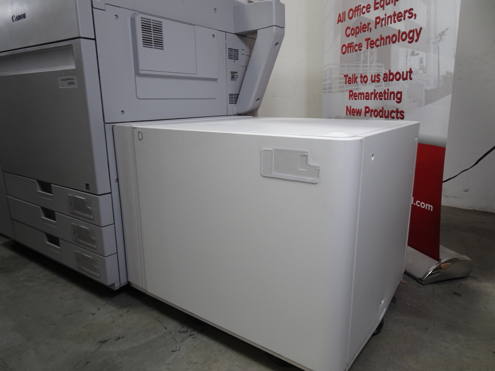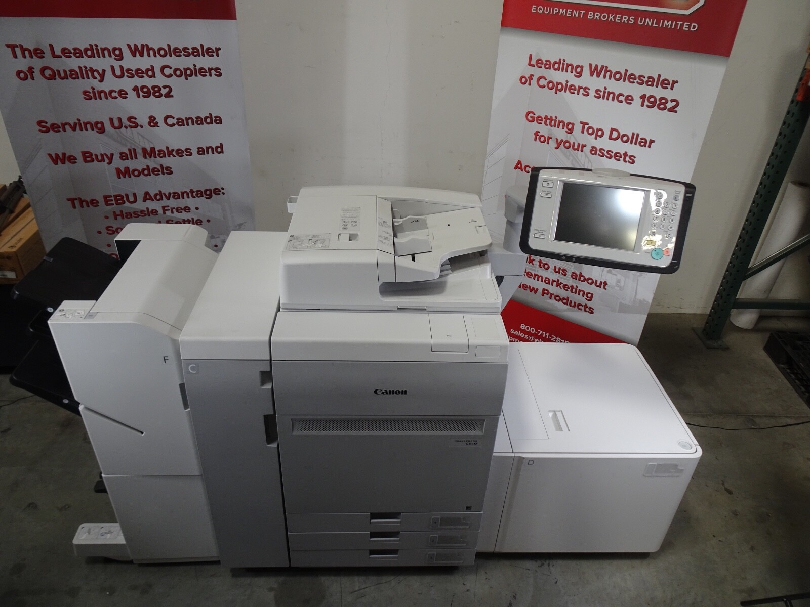 The Canon ImagePress C810 is a 80 page per minute black and white and 80 page per minute color copier, printer, and scanner from Canon. This Canon ImagePress C810 has only 276,526 copies on it and includes automatic document feeder, C1 Pod Deck Lite LCT, H350 Fiery Print controller and W1 Booklet Finisher. Recommended monthly usage on the ImagePress C810 is 500,000 copies, so with 276,526 copies this machine is at under 1 months usage. All of our copiers are tested and inspected by a certified technician. All of our copiers are guaranteed to pass service inspection (excluding consumables replacement) and come with a 100% satisfaction guarantee; if you are not happy we will pick up the copier and issue a full refund. Retail price on this Canon ImagePress C810 is $24,995, our wholesale price is $10,995. Shipping and insurance to the continental United States is included in the purchase price. Shipping quotes to Hawaii, Alaska and Canada are available.