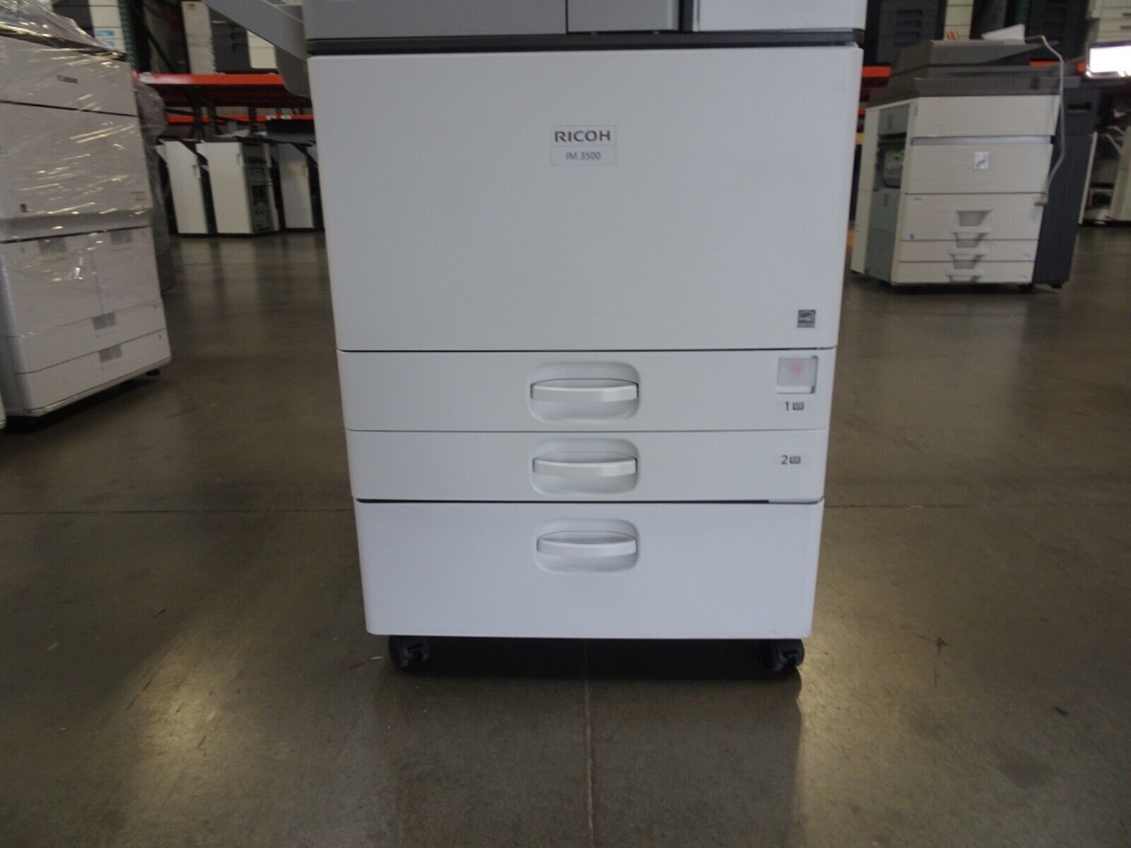 The Ricoh IM3500 is a 35 page per minute black and white copier, printer, and scanner from Ricoh. This Ricoh IM3500A has only 47,124 copies and includes automatic document feeder, network print, network scan, fax option, 4 paper trays and Internal staple finisher. Recommended monthly usage on the Ricoh IM3500 is 50,000 copies, so with only 47,124 copies, this unit is less than 1 months usage. All of our copiers are tested and inspected by a certified technician. All of our copiers are guaranteed to pass service inspection (excluding consumables replacement) and come with a 100% satisfaction guarantee; if you are not happy we will pick up the copier and issue a full refund. Retail price on this Ricoh IM3500A is $5,995, our wholesale price is $3,995. Shipping and insurance to the continental United States is included in the purchase price. Shipping quotes to Hawaii, Alaska and Canada are available.